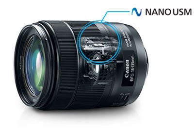 Hiện ống kính được trang bị thêm công nghệ mô tơ USM và công nghệ NANO mới. Không giống như các môtơ USM khác, bộ phận gốm áp điện của Nano USM không sinh ra chuyển động quay từ rung động siêu âm. Mà, những rung động này được chuyển thành chuyển động tuyến tính, được sử dụng để trực tiếp vận hành thấu kính nối với thanh trượt. Bằng cách sử dụng đặc điểm này, đã đạt được sự cải thiện 4,3x về tốc độ AF tối đa ở đầu tele so với EF-S18-135mm f/3.5-5.6 IS STM. Điều này cho phép lấy nét mượt mà và truyền động không ồn, cả hai đặc điểm này đều là yêu cầu không thể thiếu trong quay phim.